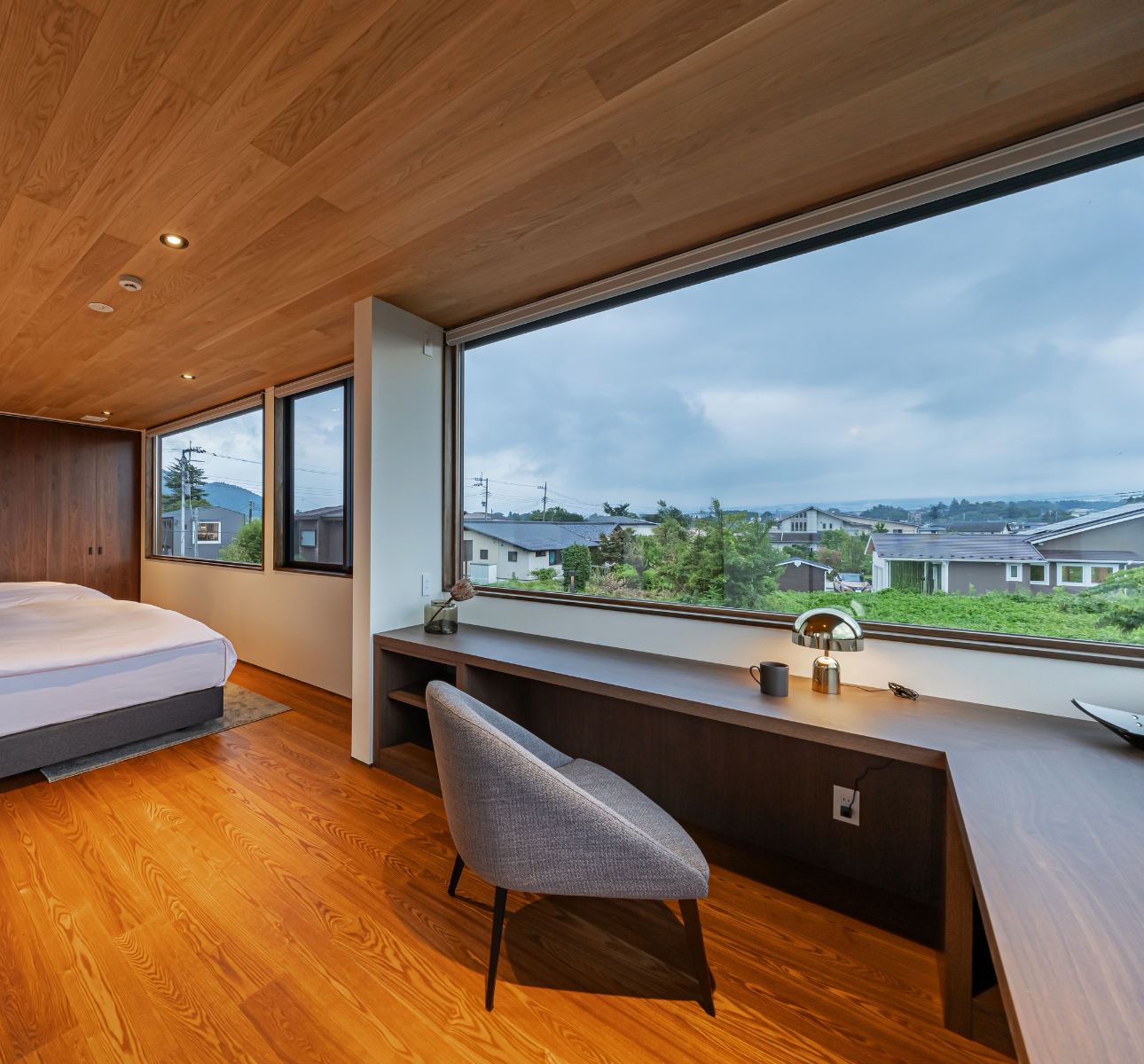 2階の寝室は書斎スペースも兼ねているので、庭で遊ぶ子供たちを見ながら仕事も可能。富士山を目の前に望めるLago随一の絶景ポイントなので、ゆっくり物事を考えるにも最適です。